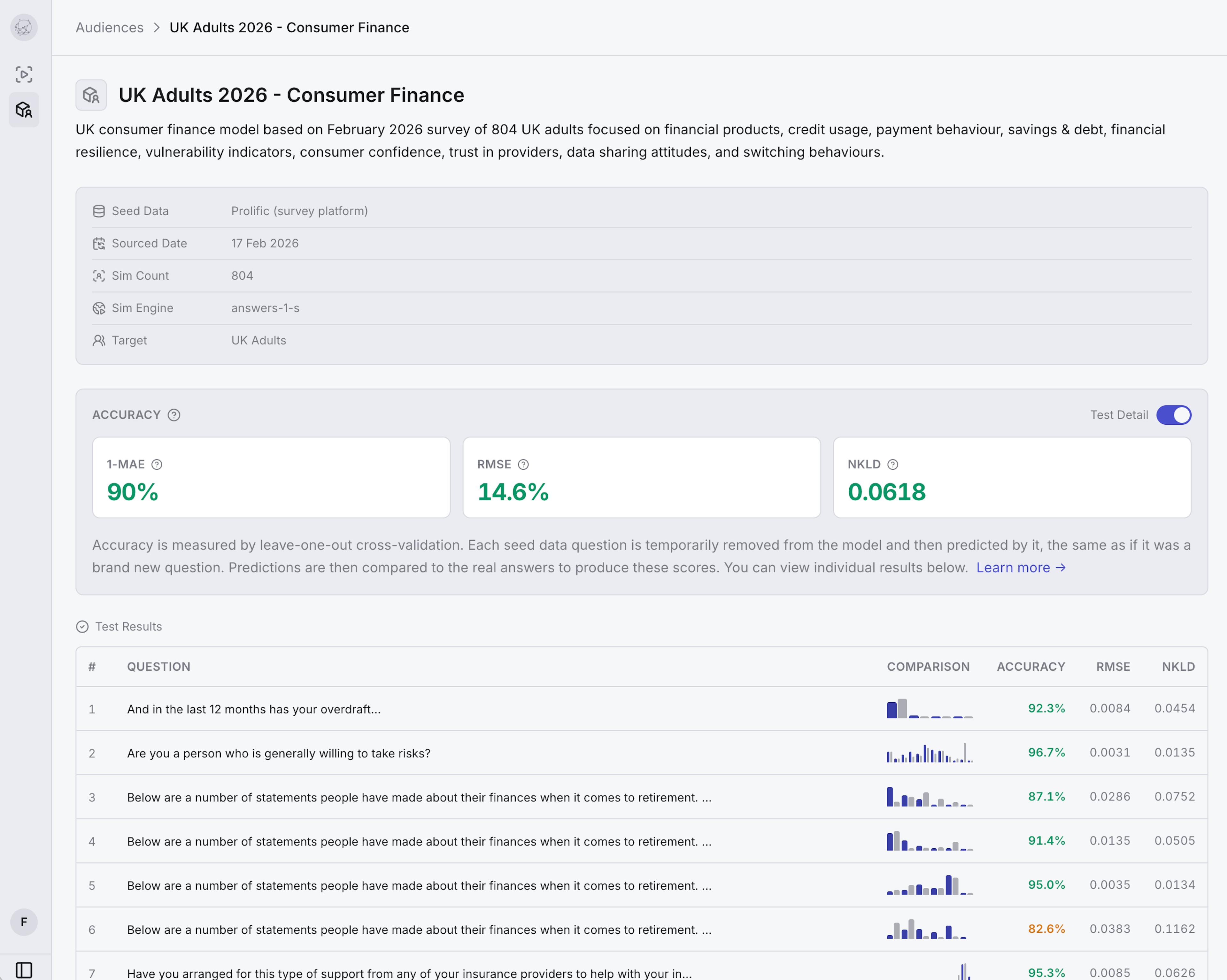 We also validate audiences against external surveys they've never seen, though these results aren't in the dashboard yet. For example, our 16 UK Consumer Finance audiences are validated against the FCA Financial Lives Survey: 212 questions the model never saw during training, with 89% average accuracy. This is a harder test than cross-validation because the questions come from a completely different source. We've published the full comparison on the blog.