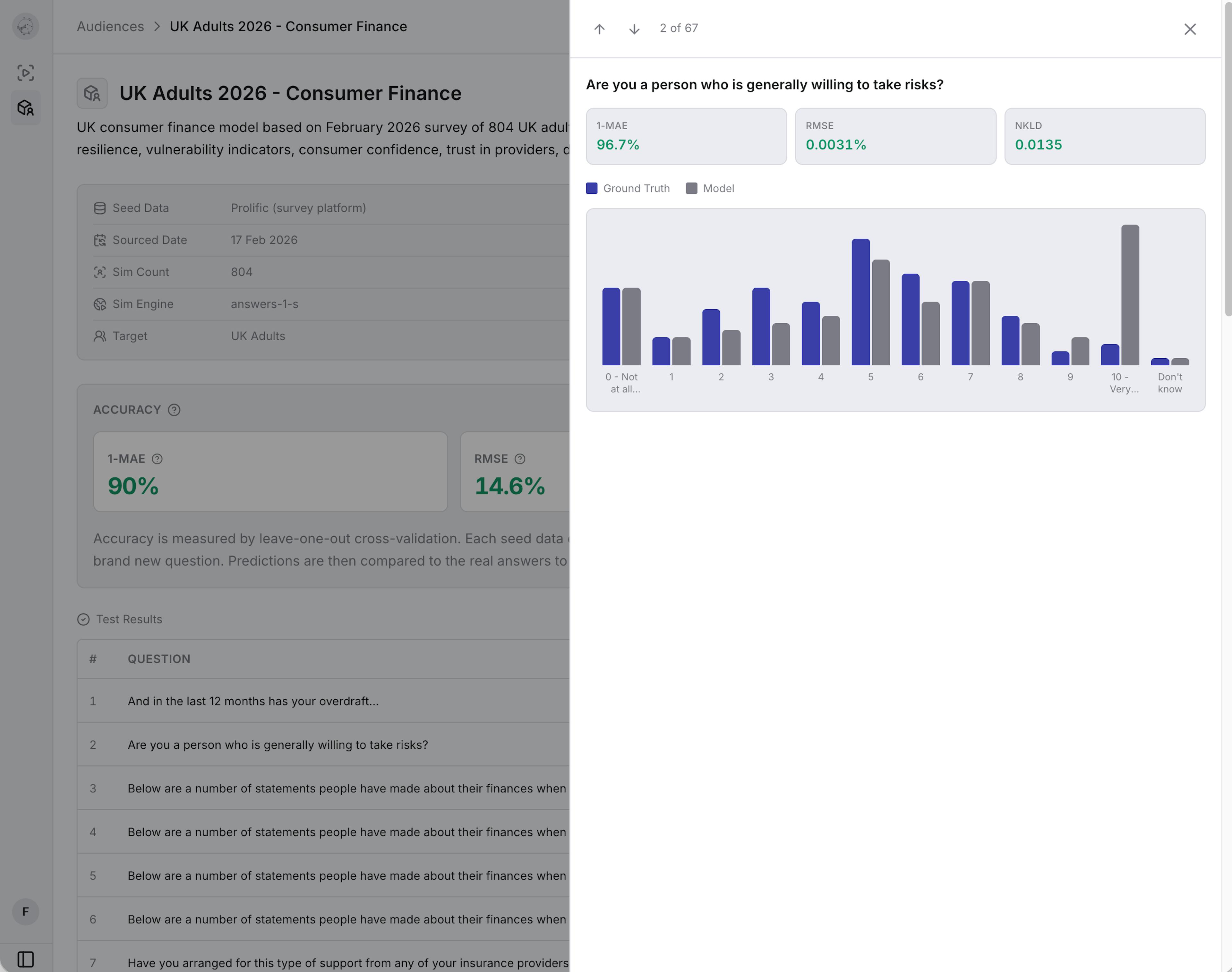 Every audience has built-in cross-validation: each seed data question is temporarily removed from the model and predicted as if it were new, then compared to the real answer. This gives you an accuracy score that the model can't game by memorising its training data. This is what the detail page shows you today.