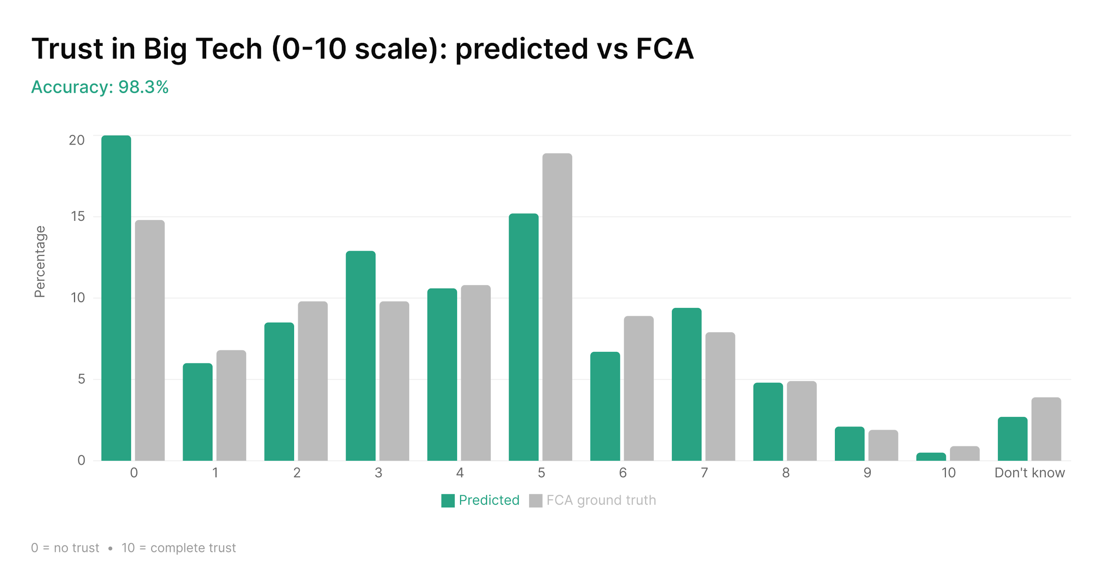 We asked the model how much people trust Big Tech, on a scale from 0 to 10. The FCA asked 19,000 real people the same question. Twelve options. The model matched the FCA's distribution across every single one. The skew toward distrust, the mid-range hump, the long tail toward total trust. All within a few percentage points.