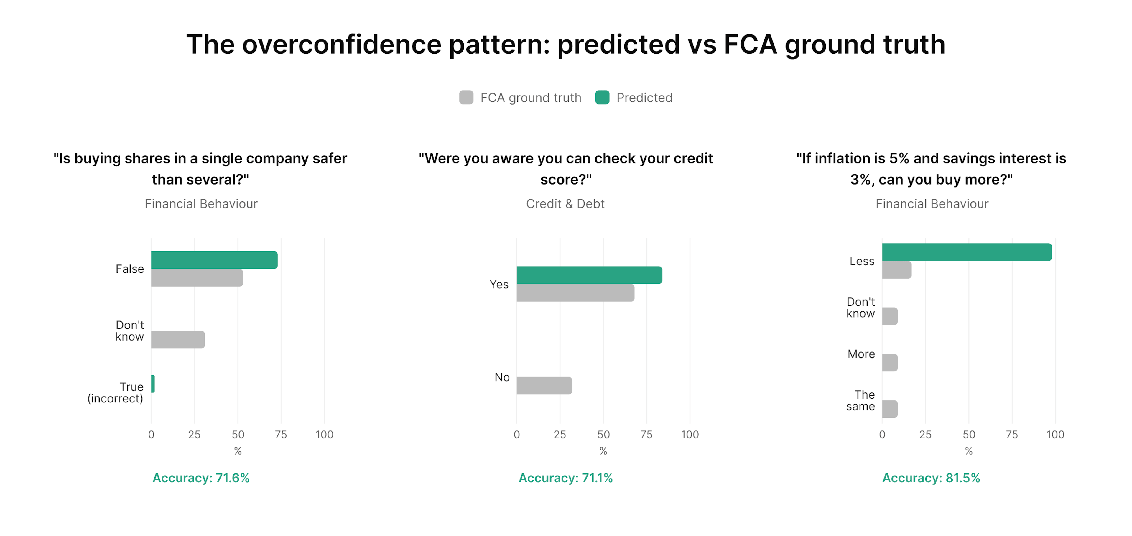 207 questions from the FCA Financial Lives Survey, tested out-of-sample. Here's where the model is strong, where it struggles, and why the pattern matters.